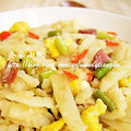 写有这道面食。土豆洗净去皮用擦子(这个擦子是山西人专门用来做面食擦蝌蚪滴)擦成扁长条型状。放入冷水洗去淀粉,然后沥干水分加入适量面粉,让每根土豆丝上都裹上面粉即可,面粉不可太多也不能太少水开后上蒸笼蒸10分钟,蒸好后土豆丝会粘在一起,稍微凉一些用筷子打散蒜薹,红辣椒...