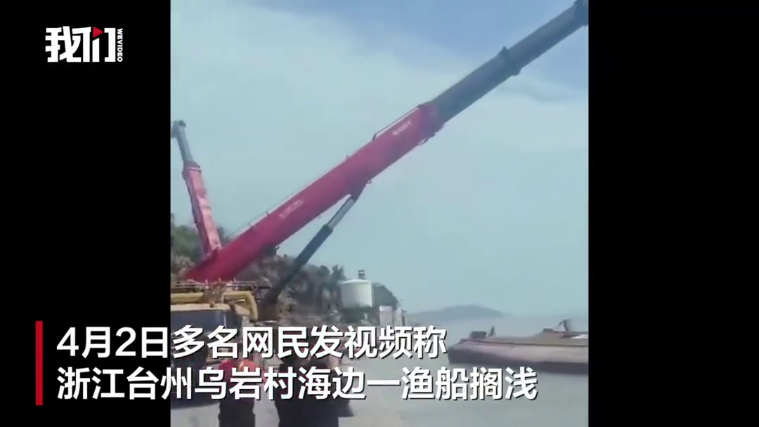 多名网民发视频称,浙江台州乌岩村海边有一艘渔船搁浅。 台州海边搁浅渔船系退潮时碰到礁石,记者从乌岩村委会获悉,初查系1日晚退潮时渔船碰到礁石搁浅侧翻。乌岩村委会工作人员称,暂无人员伤亡报告,打捞仍在进行。 画面显示,已有吊车到场救援。吊车公司工作人员告诉记者,吊车未能成功打捞渔船。 有网友称,这汽车吊老板胆子太大了,这么大的活也敢接 今天换了更大的船吊来救,这要花多少钱啊