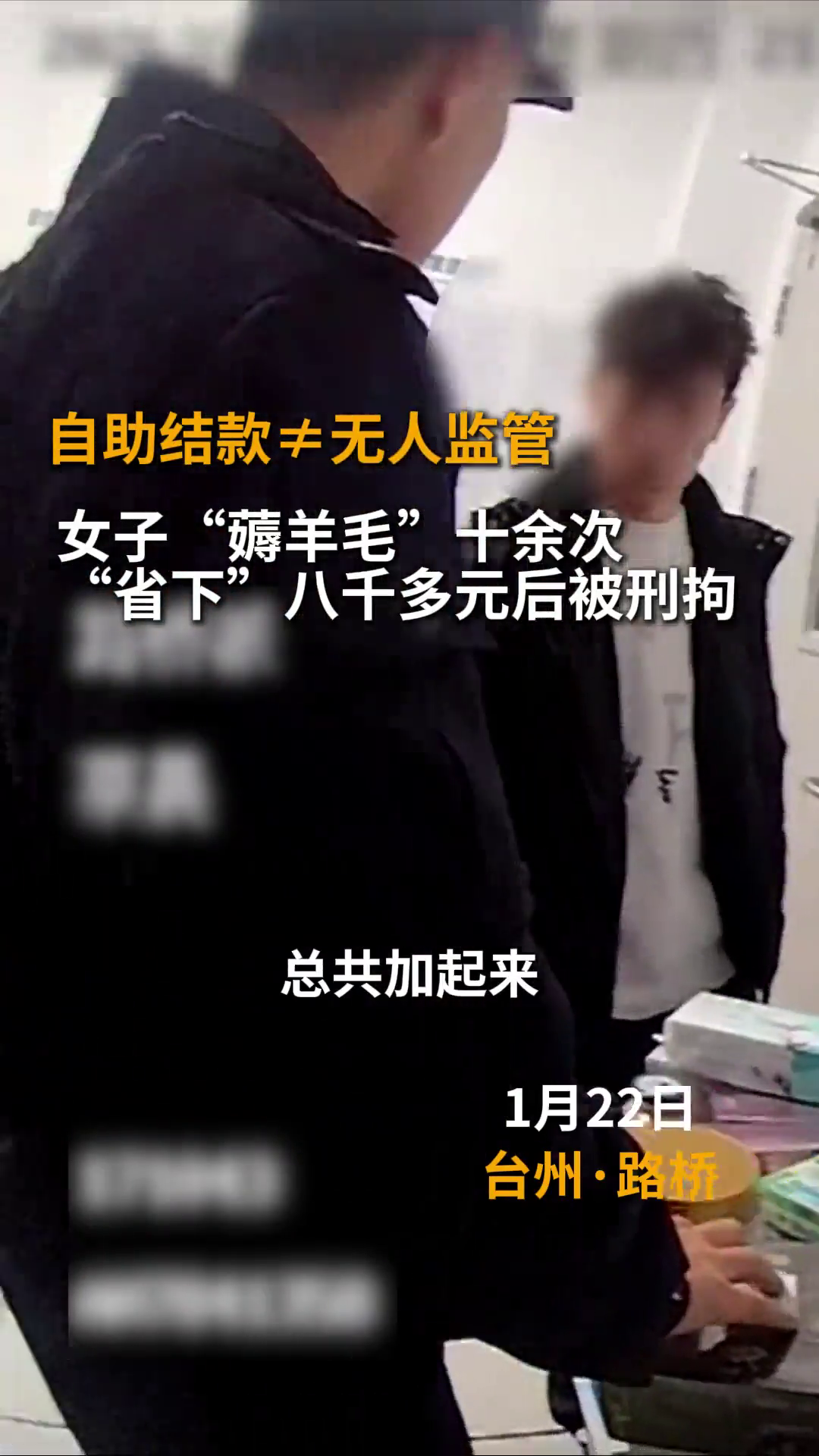 1月22日,台州路桥,一女子“薅羊毛”十余次“省下”八千多元后被刑拘 该女子通过自助结款机只扫描支付部分费用逃单10余次,目前该女子已被依法刑事拘留