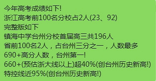 玉环中学 镇海中学(台州)680分以上32人 书生书生特控线上线人数150+,最高分679 台州中学 台州一中浙大上线人数100人+,特控上线人数521人 北师大 临海学校汇总 温岭中学 温岭二中 九峰中学 温中双语 新河中学 楚门中学 天台平桥二中 松门中学 台州市外国语学校