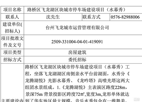 路桥区飞龙湖区块城市停车场建设项目(水幕秀)工 程,坐落飞龙湖湖区南侧亲水平台前湖面,水秀分《 龙腾湖悦》光影水幕秀、《龙吟塔》高喷光塔这两大 组团水景组成。1.《龙腾湖悦》主表演区路度228m, 景深75m背景投影区跨度72㎡,宽度3m,龙形单体就达 到了华东地区最大规模,音乐水秀包金有一维舞美、 气爆跑泉摇摆投影天幕、变频跑泉、喷火、人造雾等 各种水形。融合灯光秀、激光、音响、投影等部分。 是