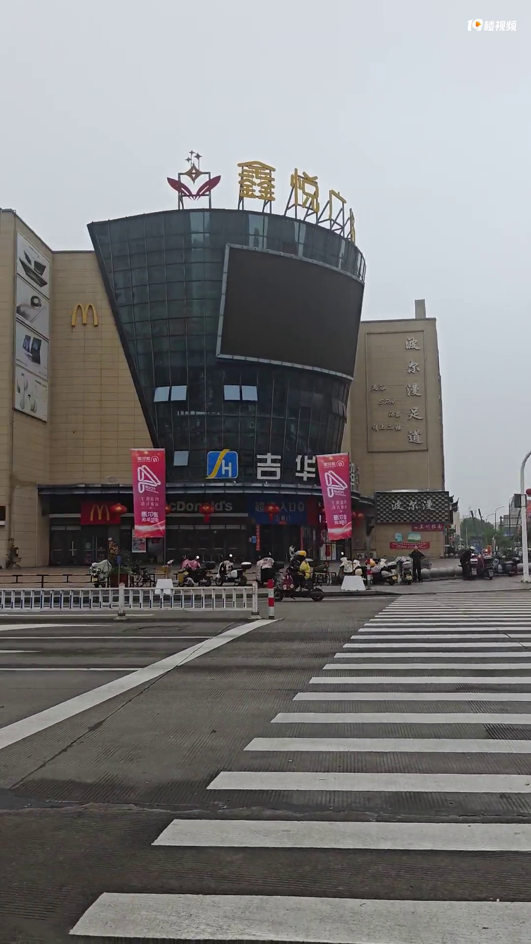 鑫悦广场地上插红旗、天上漂红气球,还有红色拱门。