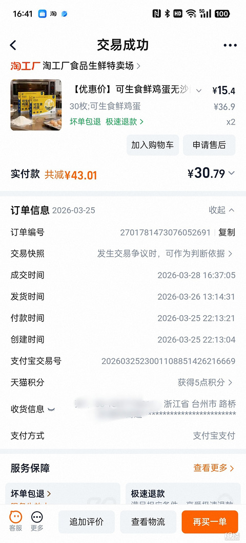 京东快递员下午16:28打来电话,说要把鸡蛋送到我楼下,等我下楼在三楼碰到他。打开一箱鸡蛋包装,一箱里面有二层,每层15个,鸡蛋外壳光滑,生产日期是3月26日,我3月25日下单的,真新鲜。这个鸡蛋包装真好,不像买的其他鸡蛋鸭蛋包装,用泡沫箱里面加稻壳包装,我都要在物业拆包装,以免在家里拆弄得稻壳乱飞。这次京东快递员还送到家里。