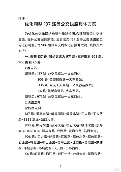 转自台州市交通运输局:根据《城市公共汽车和电车客运管理规定》《台州市公共汽车客运管理办法》《台州市市区公交线路管理工作规范(试行)》等规定,现将优化调整137路等公交线路事项予以公示(详见附件)。对公示的事项,如有意见,请以书面形式向我局反映。个人反映意见须署名并附联系电话,单位反映意见须加盖单位公章。公示有效期为5个工作日。自2025年4月21日起至2025年4月28日止。联系地址:台州市白云山