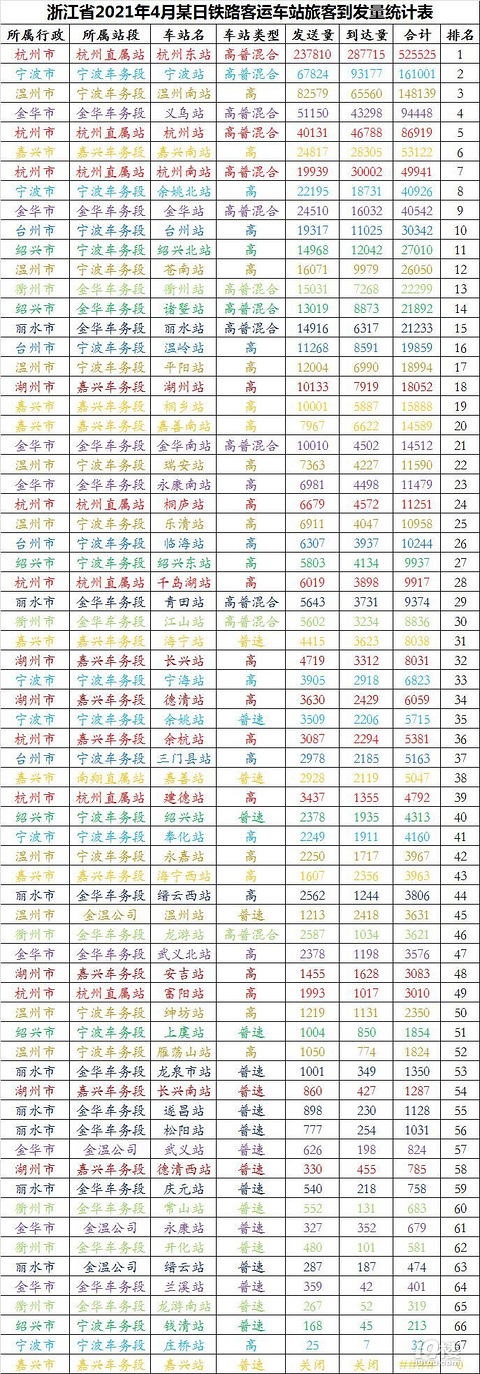 转发4月某一天浙江各火车站的客流到发人数!