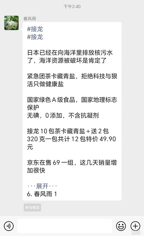 好多团购群都在卖湖盐,你说加碘盐被影响了,买一点还能理解湖盐有影响吗?