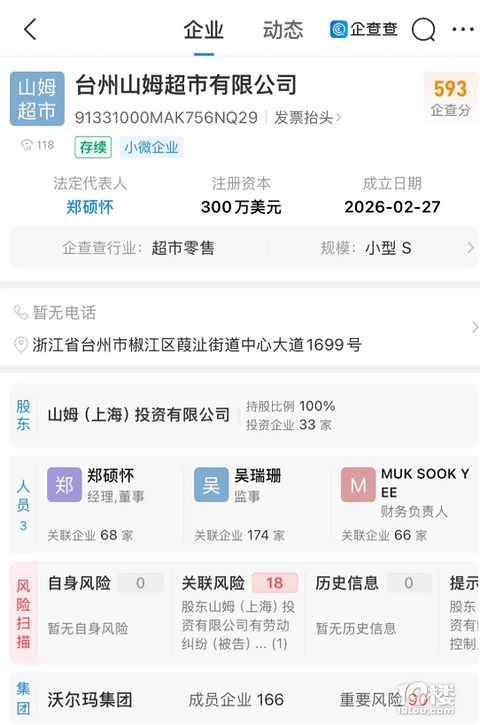 台州山姆超市有限公司成立!