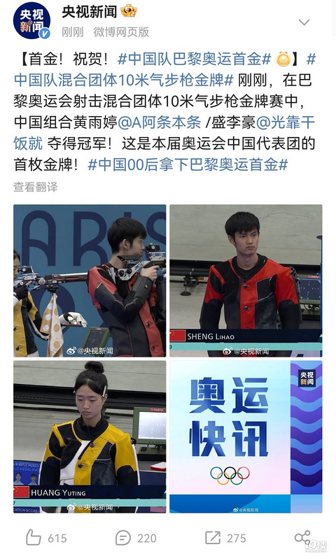 创造历史!台州黄岩姑娘黄雨婷夺得巴黎奥运首金