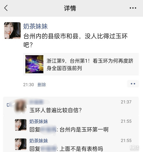 如题,我朋友圈转发了一个玉环发布发表的全国百强县综合实力玉环排名台州第一,然后这个人就开始恼羞成怒了…(ps:我省略的是她发的gdp排行榜)