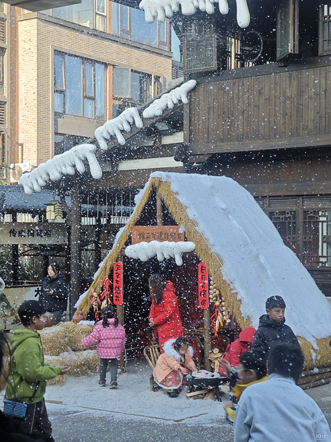 下过“雪”后,大家围着石臼,师傅拿着石锤捶打里面的米,一旁有人帮忙调整。石臼里的乌饭麻糍,被木槌一下下重重捶打,它在臼里随着撞击翻涌、变形,表面泛起细腻的纹路,石锤抬起的瞬间微微颤动,像是在跟着石锤的节奏“跳动”,被捶得愈发软糯紧实,热气也在这反复的捣击中慢慢升腾。周围人看得可认真,好不热闹。