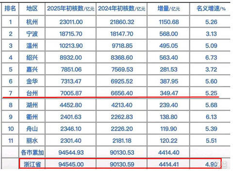 浙江省暨各地市2025年GDP出炉(初核)