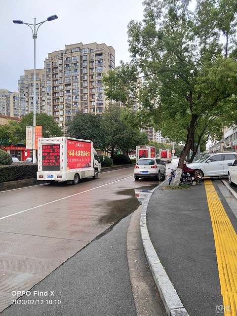 看见三辆广告车在游行。