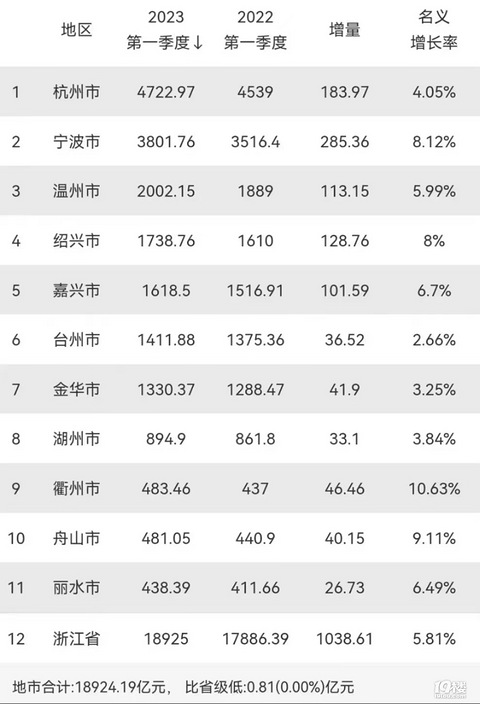 宁波超越天津,按此增速今年大概率会挤到全国11名。浙北双城记算是成了。进一步拉近与杭州的距离。嘉兴按此增速,全年会与台州拉开900亿的差距。进一步扩大优势。目前浙江是3个梯队,杭甬、温绍嘉、台金湖