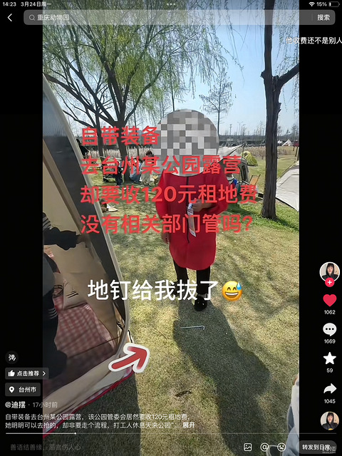 近日某音一外地博主前往飞龙湖收费露营地(揽月露营地),工作人员前来收取露营费120元,博主大骂工作人员并拒绝支付露营费!扬言到没有围墙阻止,凭什么不让进! 工作人员向博主解释对面有飞龙湖免费露营地,博主依旧我行我素,工作人员只好强拆帐篷,博主白嫖失败,事后发视频抹黑台州飞龙湖门票120元,不交钱不给坐。声称台州公园都是收费的,难怪没有人来台州!