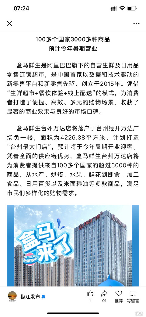 今天看到椒江又说什么椒江首店、自己盒马台州最大门店,什么都要争,台州本来就够散装了[/11尴尬]就像上次好利来也是