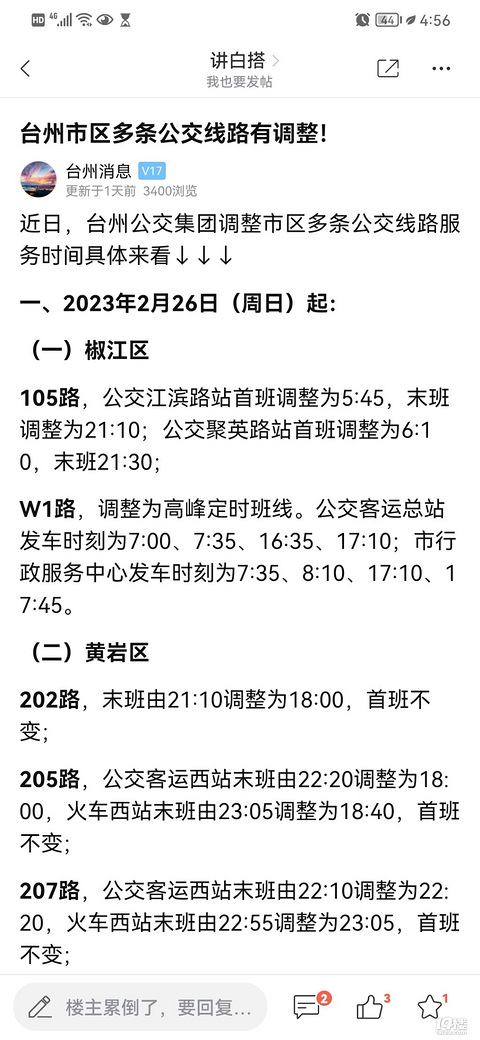 看到19楼发了一则关于《台州市区多条公交线路有调整》的消息,咋一看标题还以为是路线调整,细看却是营运时间调整,而且全部是缩短,但没有说明原因,港港厢是什么原因?确实看到过公交车夜晚时段只有一个乘客“包车”,而且还有放空的……