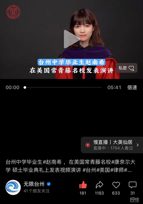 台州中学毕业生#赵南希 ,在美国常青藤名校#康奈尔大学 硕士毕业典礼上发表视频演讲 #台州#美国#律师#台州中学#浙江大学#令人心动的offer