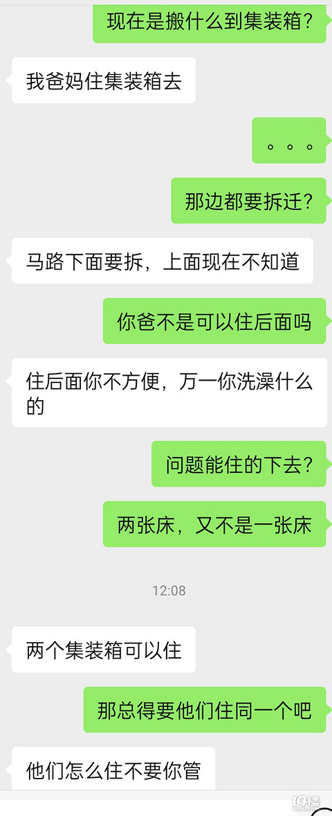 让他父母住密不透风的集装箱,也是一般般的,不算好的,新的,还一人一张床(很早吵架了一人一张床) 听着都心疼,幸好不是我父母,跟我无关!