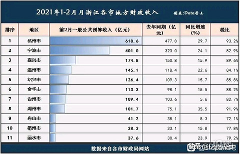 浙江2021年1-2月各市财政收入