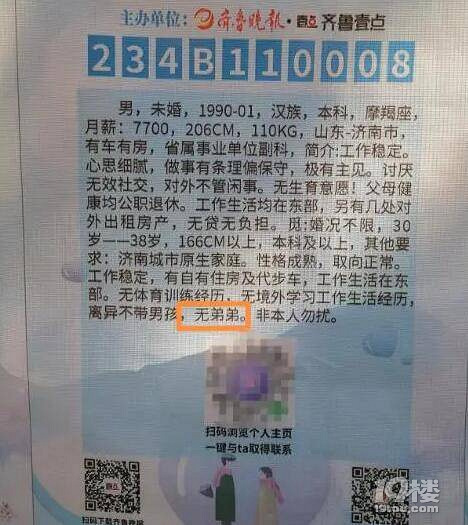 2023-04-22 12:10 新浪新闻 4月21日,由齐鲁晚报·齐鲁壹点主办的第17届壹点动心·三月三千佛山相亲大会在济南千佛山风景区东门内广场火热进行中,吸引无数单身男女来到相亲会现场,找寻自己的有缘人。现场的嘉宾信息牌成为“红线”,牵起了前来寻缘的单身嘉宾。记者注意到,要求女方不能有弟弟,成为不少男生的择偶条件之一。一位90年男嘉宾在信息牌上明确了自己的择偶条件,他希望女方除了工作稳定、有