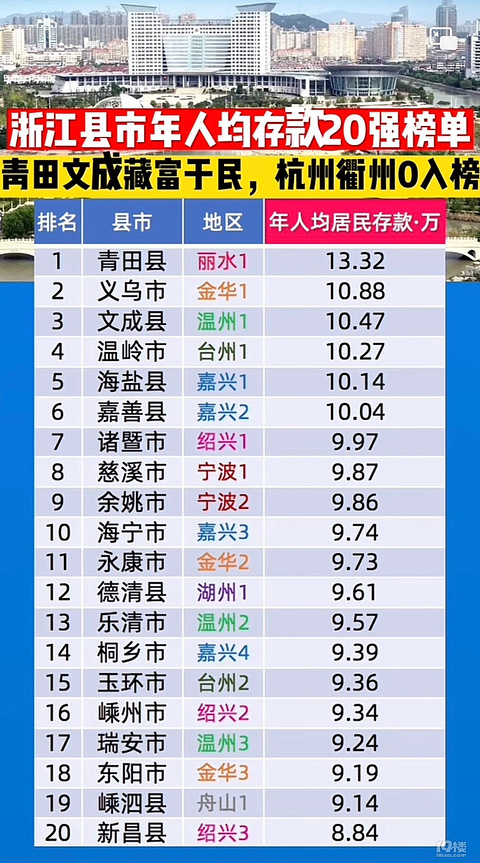 浙江县市存款排名出炉,青田文成藏富于民!
