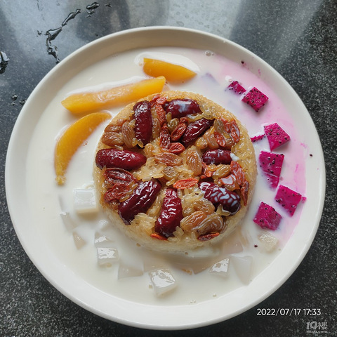 自制美食名称:八宝饭需要的材料:糯米,各种水果或许水果罐头,牛奶难易指数:3星。(5星:非常难 4星:有点难 3星:一般 2星:简单 1星:手残党都会)制作注意点:现在夏天,泡糯米最好放在冰箱冷藏,这样不会酸了夏天来一碗甜甜的,冰冰凉凉的八宝饭,真的很开胃哦!糯米早上泡的,洗干净加水放在冰箱冷藏红枣葡萄干枸杞,反正有什么放什么先摆个底然后放上泡好的糯米用瓢羹压紧实了,加入刚好和糯米平的水,放锅里蒸