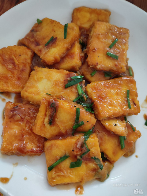 自制美食名称:家常豆腐需要的材料:豆腐,难易指数:1星。(5星:非常难 4星:有点难 3星:一般 2星:简单 1星:手残党都会)制作注意点:煎炸蒜末的时候一定要小火,油温不能太高,不然就黑焦了逛超市看到半成品家常豆腐,就买了七两多,自己烧着简单。超市买的半成品豆腐调个汁:生抽,耗油,白糖,淀粉,盐,加水搅匀锅里四五成油温下蒜末放入豆腐两面煎一下,倒入调好的汁大火煮开再收干汤汁撒点葱花出锅了,味道不