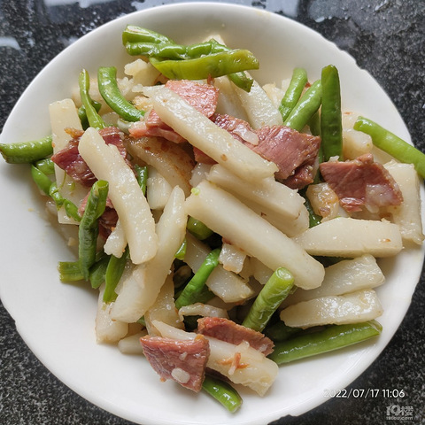 自制美食名称:火腿肉炒年糕需要的材料:金华火腿,蔬菜(我用了茶豆),年糕难易指数:2星。(5星:非常难 4星:有点难 3星:一般 2星:简单 1星:手残党都会)制作注意点:火腿很咸了,不要加盐哦!油锅烧热加入火腿片炒炒变色加入茶豆翻炒等茶豆变色了,半熟了就加入年糕,加点老酒翻炒,快熟了再加点鸡精就可以了!