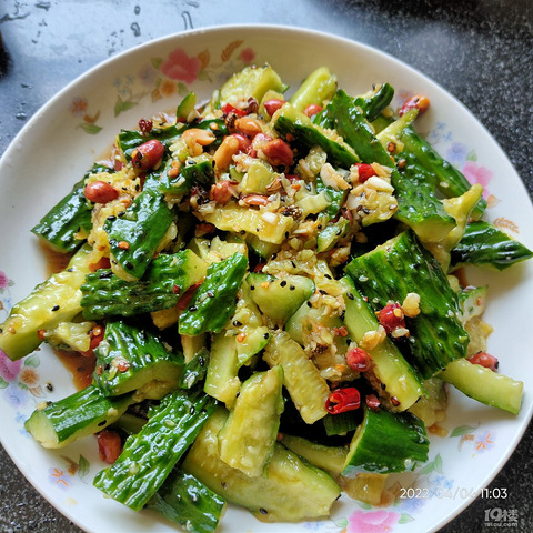 自制美食名称:凉拌拍黄瓜需要的材料:黄瓜,花生米难易指数:2星。(5星:非常难4星:有点难3星:一般2星:简单1星:手残党都会)制作注意点:黄瓜拍一下再切段,更入味哦!黄瓜洗干净擦干水,用刀背拍扁再切段炸个花生米拌黄瓜花生米出锅了大蒜末,小米辣,黑芝麻放碗里,加热油激一下黄瓜段放入盐,鸡精,生抽,醋,刚才热油泼的蒜末,花生米,白糖,香油,辣椒油搅拌搅拌,装盘, 好好吃哦!天气热了,很开胃!