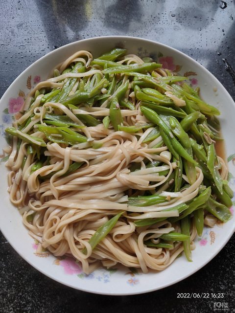 自制美食名称:豆角焖面需要的材料:豆角,面条难易指数:2星。(5星:非常难 4星:有点难 3星:一般 2星:简单 1星:手残党都会)制作注意点:干挂面最好蒸一下,更筋道好吃哦!旁边外地人种的豆角,给我妈一把,然后就想着做焖面吃,没买肉 就素食吧!锅里放猪油,油热加入蒜末炒香,倒入豆角,我喜欢这么切,入味煸炒变色,加入盐,生抽,耗油,老酒酒精加入水,水稍微多一点,因为我的是干挂面水开盛出来一碗汤备用