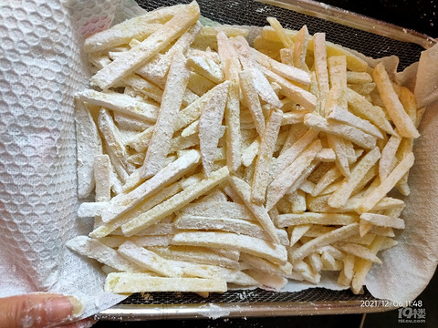 自制美食名称:自制薯条 需要的材料:土豆,淀粉 难易指数:2星。(5星:非常难 4星:有点难 3星:一般 2星:简单 1星:手残党都会) 制作注意点:土豆尽量切大小均匀一点想周末吃薯条,先准备起来外面买的油不放心。土豆切大小均匀的条,泡水十分钟洗去淀粉,水开放入土豆条煮一分钟捞起放入凉水中泡一下拉出来沥干水分或者厨房纸巾擦干干了之后用玉米淀粉裹匀倒入淀粉裹匀一层一层铺好继续裹匀剩下的 上面有的没