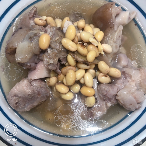 自制美食名称:红烧猪蹄,黄豆猪蹄需要的材料:猪蹄,姜,八角,辣椒,老酒难易指数:3星。(5星:非常难4星:有点难3星:一般2星:简单1星:手残党都会)制作注意点:由于一只猪蹄太大了,就两吃了红烧猪蹄,放了香菇,老抽多放了点黄豆猪蹄,我就没放酱油步骤1:需将黄豆提前浸泡半天,将猪蹄洗净焯水2-3分后冲洗干净。步骤2:锅内下油,待油热时下生姜片、葱段,八角,猪蹄爆炒,料酒翻炒下。步骤3:加水没过猪蹄,