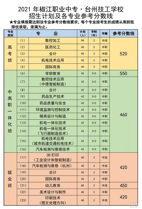 椒江职业中专台州技工学校2021年参考分数线,学前教育550分