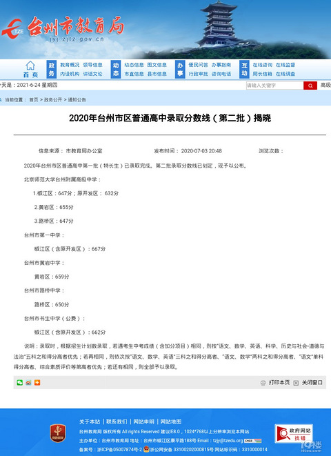 2021年浙江省高考分数线出炉!6月25日晚上20:30左右,考生即可登录浙江省教育考试院网站(www.zjzs.net)、浙江考试微信或浙里办APP,凭准考证号和密码查询自己的高考成绩。为让考生第一时间知晓,避免因网络拥堵无法及时查询,省教育考试院还会以短信方式将考生本人成绩信息提前发送到高考报名时留存的手机号。2021台州各地普通高中录取分数线消息来源:浙江考试院/台州教育