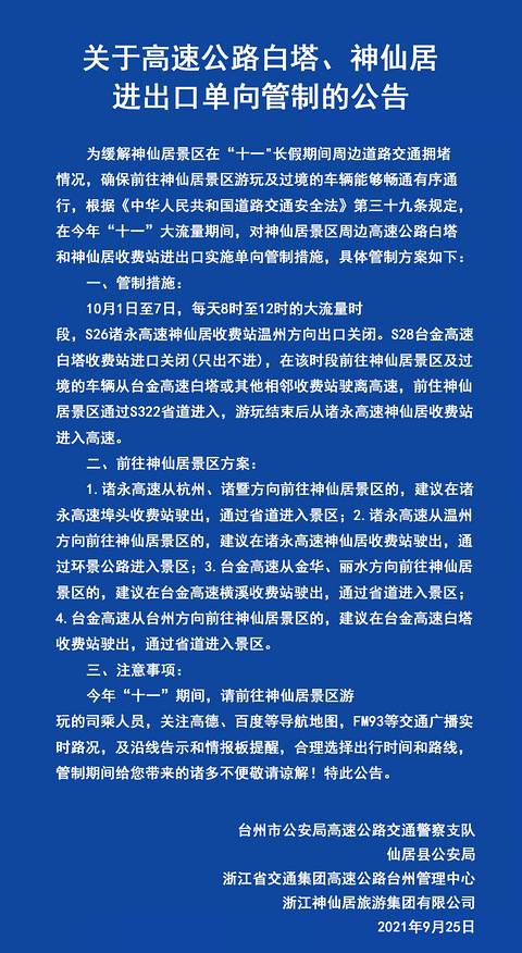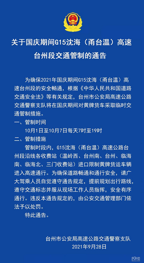 国庆期间,甬台温高速台州段,将采取交通管制!