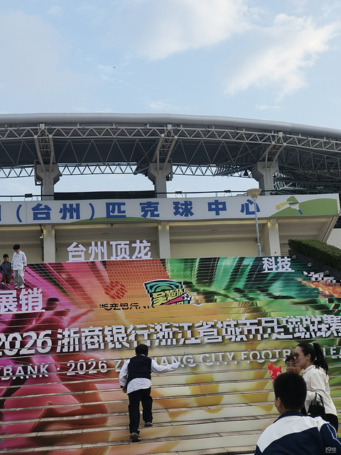 周五带着小蒋去台州市体育馆看吴越杯足球赛。为了不堵车,一下班就在体育馆附近停好车,带着小蒋步行前往。进场前就有超多亲子小游戏!足球射门挑战、体能项目游玩,鸵鸟的足球小场地,娃玩得不亦乐乎,还赢了小礼物,舞台上还有各种的小朋友表演,舞狮,武术表演,完全不无聊!一进场馆就被满场的红色海洋震撼到了!几万人一起为台州队呐喊,加油声、欢呼声此起彼伏,娃拿着加油棒跟着挥,全程眼睛都没离开过球场!现场看球真的和
