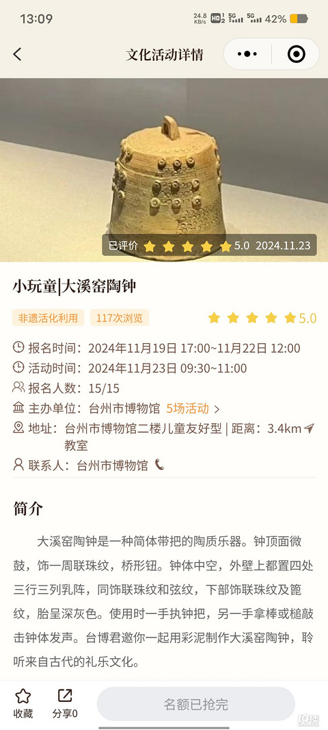 博物馆每周都会推出一些活动,名额有限,真不好抢上周竟然让我抢到一个活动名额,早上带着他参加,他动手,我逛逛博物馆还是很不错的。在博物馆的三楼遇到小小讲解员,介绍大奏鼓的女孩子才幼儿园大班。有个想法,有机会让小阮也参加培训,去做志愿者,锻炼锻炼。 成品,是不是还不错。