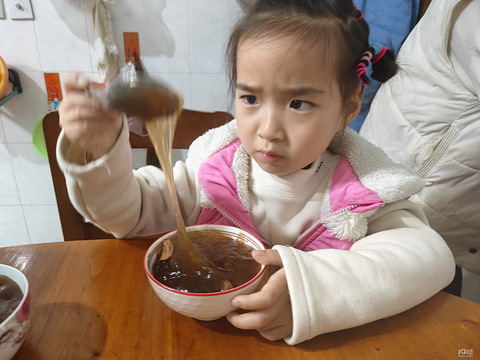 工作的元宵不回娘家,所以周日先吃个山粉糊,娃以前没吃过,这次吃了几口,果然是北方的娃,喜欢吃山粉糊里面小汤圆。