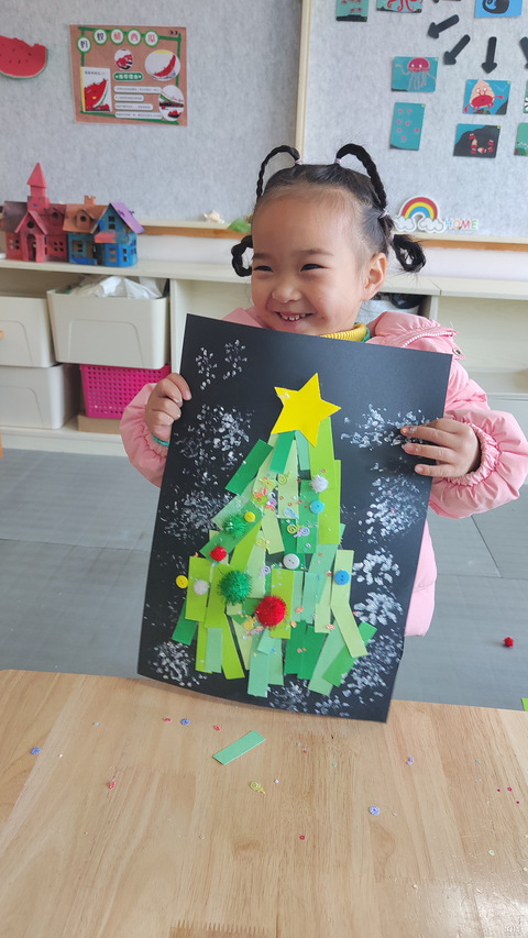 今天绘本故事课,跟老师一起做了一棵漂亮的圣诞树。去外婆家就挂在外婆家了,说自己家已经有一棵了。