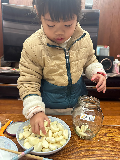 幼儿园布置的作业,让做腊八蒜!从幼儿园拿回来很多蒜和小半瓶白米醋,我一到家就让我和她一起扒蒜~后面放到玻璃罐里加了白米醋和冰糖