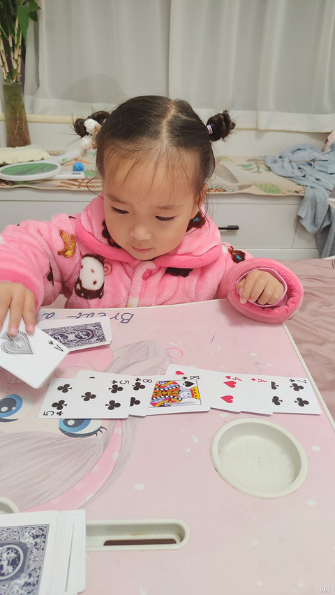 看家里有纸牌就跟娃玩纸牌游戏。小朋友玩的很开心。游戏一:小猫钓鱼,这个我们小时候也经常玩。游戏二:形状归类,想跟娃讲了一下这四个形状名称,然后让娃把纸牌相同形状归类在一起。游戏三:数字排列,同一形状的纸牌按照2到10排列出来。反正就是跟娃打发时间,娃也挺喜欢纸牌的。