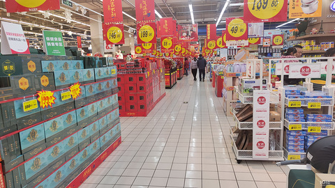 大润发超市年味氛围浓一周都要带娃去个一两趟这次去懒得给她换衣服直接穿着睡衣逛超市虽然年货很多但是没什么好买的买了好吃三文鱼回家蘸着酱油芥末吃