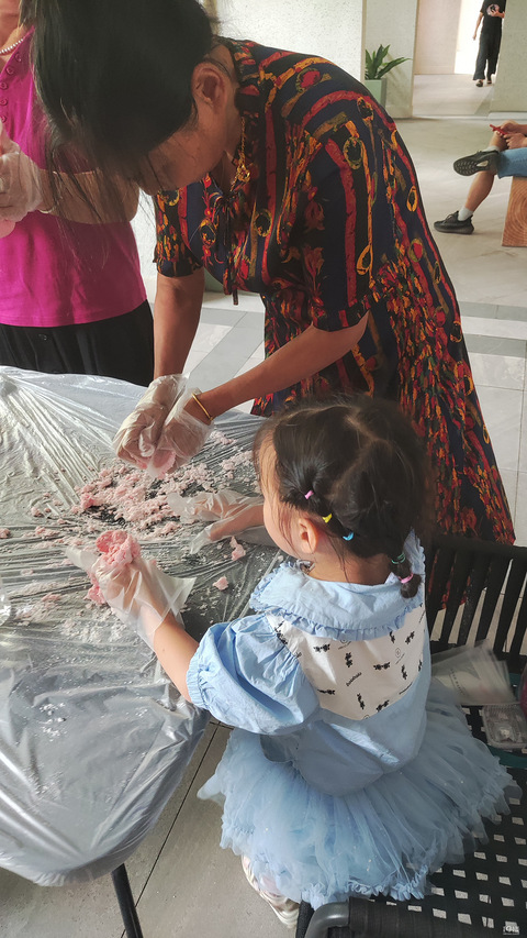 小区组织做冰皮月饼,带娃去了,没想到是要自己揉粉的,马上喊上婆婆,西瓜味冰皮月饼,里面有榴莲馅,紫薯馅,莲蓉馅等。娃也参加进来,可能在幼儿园做过月饼了,也还能认真做着。