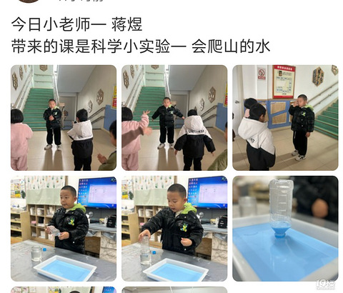 时隔半个月,又一次轮到小蒋当小老师了。为了能够成功做出完美的实验,我们提前在家练习了一遍,哈哈哈。果然很完美[/11大笑][/11大笑][/11大笑]小老师当的有模有样的,然后给大家演示“会爬山的水”,然后教小朋友怎么操作,他还在旁边专注着实验是否成功。学校安排的这个体验真不错,那下一次做什么小实验呢?[/11坏笑][/11坏笑][/11坏笑]