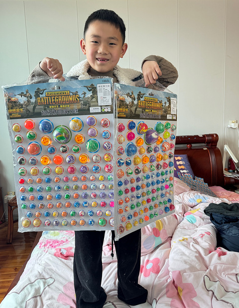 上回在商场里看到这种弹力球,10元钱可以抽3个,抽到3个小小的。他爸就说给他网上买一整板的。后来一下子买了3板,其中一板还说是发光的。拿到手之后,就一直拉着我们玩抽奖,这个另外有一个抽奖券的,抽到几号就拿几号的球。早上出门还带了两个大球,说晚上去接他的时候他可以第一时间拿到球玩。