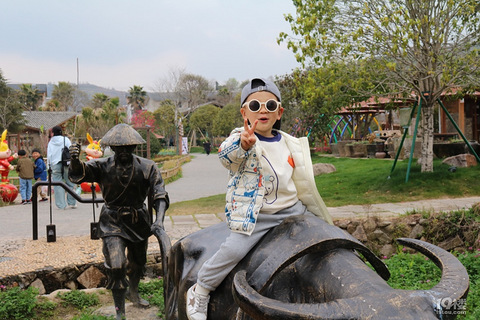 春天来啦,户外活动安排起来,一起去拥抱快乐吧~椒江开过去一个多小时,短途一天游的好去处~进园区带上酷酷哒墨镜先跟老牛来个合影吧还有来测测肺活量吧[ej=1F604]不得不说这个乐园还是蛮大的,对于这个年龄段的娃来说,走走玩玩,一天下来还玩不完。而且很多项目除了有年龄要求,还有身高限制,1米以下的娃玩不了明星项目虎溜溜哦。那么刺激的玩不了,咱就去【农耕乐园】,体验农耕乐趣吧。水车、打陀螺、滚铁环、茅