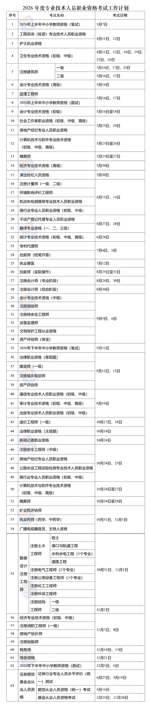 近日,人力资源社会保障部办公厅印发《关于2026年度专业技术人员职业资格考试工作计划及有关事项的通知》。 大家关心的考试时间表定了!快收藏好! 注意哦! 证券期货基金业从业人员资格各次考试地点不同,计算机技术与软件专业技术资格、精算师上下半年的两次考试科目不同,具体安排以相关考试公告为准。 如遇特殊情况需要变更考试日期的,将提前另行通知。 国家职业资格考试实行统一大纲、统一命题、统一组织,要引导符