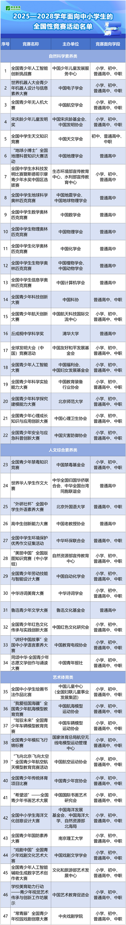 教育部近日印发通知,确定47项竞赛活动为2025—2028学年面向中小学生的全国性竞赛活动。一起看名单—— 《通知》明确—— 2025—2028学年面向中小学生的全国性竞赛活动,举办时间原则上为2025年10月至2028年8月,在此期间每学年举办不得超过1次,累计不超过3次。竞赛以及竞赛产生的结果不得作为中小学招生入学的依据和高考加分项目,不得在高校招生中违规使用竞赛结果。 为方便广大家长学生查