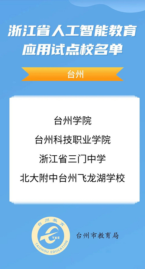 近日,省教育厅公布浙江省人工智能教育应用试点校名单。经各地各高校组织申报、专家评审、综合遴选和公示,并提交省教育厅党组会审议,确定100所学校为浙江省人工智能教育应用试点校。其中,台州4所学校入选名单,一起来看看~ 近年来,市教育局高度重视人工智能教育,通过顶层谋划、精准突破、协同推进,加强师资队伍建设,创新人才培养方式,强化试点学校培育,持续推动人工智能与教育教学融合,提升教育信息化