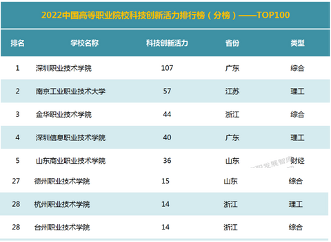 近日,高职发展智库正式发布“2022中国高等职业院校改革活力指数排行榜”(简称“活力指数排行榜”)。其中在“科技创新活力”排行分榜中,台州职业技术学院位列全国28位、全省第6位,也是该校首次进入排行榜。 “活力指数排行榜”自2019年发布以来,至今已连续发布三年。“活力指数排行榜”对全国高职院校(含本科层次职业学校)的标志性成果进行了全方位的观察,在一定程度上反映了新时代全国高等职业院校深化教育教